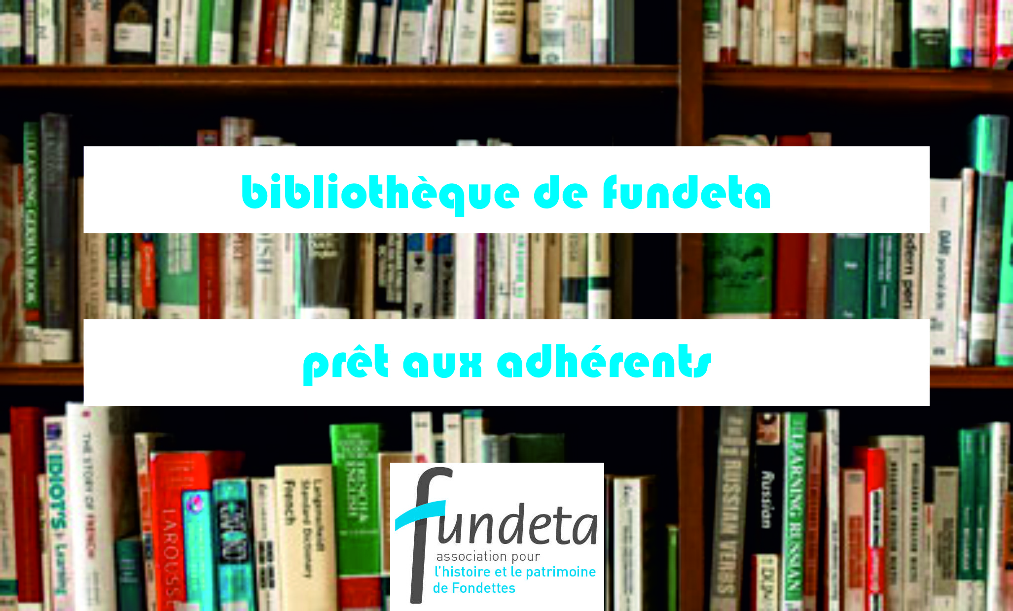 Nouveau service : l’association FUNDETA propose à ses adhérents un nouveau service de prêts de livres sur des thèmes d’histoire et de patrimoine. Dans ces thèmes les livres sont classés en trois catégories géographiques : Fondettes (F), Tours et Touraine (T), ou général (G), et concernent l’histoire et le patrimoine proprement dits, mais également certains guides historiques, dictionnaires, aide à la recherche, etc.